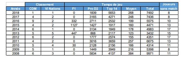 COUPE DU MONDE - France U20 : quel temps de jeu chez les pros pour les Bleuets cette saison ?Pour en avoir le coeur net, il a fallu analyser le temps de jeu des joueurs sélectionnés chaque année avec le XV de France U20 pour disputer le mondial de leur catégorie depuis la création de cette compétition en 2008. Notez que de 2008 à 2011 inclus, seuls 26 joueurs étaient convoqués. Depuis 2012, 28 joueurs ont la possibilité de participer au mondial (hors blessures). Vous pouvez d'ailleurs retrouver tous les tableaux qui détaillent les temps de jeu. On a sorti nos calculatrices pour vous présenter deux-trois éléments qui mettent en lumière l’évolution de la forme de la formation française. Si la génération 1988, qui a joué la coupe du monde en 2008, fait exception et a établi un record de temps de jeu total qui n’a jamais été égalé ou même approché, on constate que les Bleuets de cette année ont pulvérisé le record de temps de jeu au sein du Top 14.
