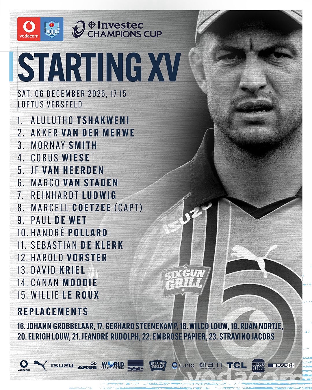 Côté Bulls, la réception d’un club français est souvent un marqueur. Surtout quand celui-ci est le champion en titre. Ils joueront pour imposer leur densité physique et tester la capacité de Bordeaux à encaisser les collisions. L’arbitrage au sol sera donc capital : Woki–Vergnes-Taillefer vs van Staden–Coetzee, c’est un duel qui peut faire basculer la rencontre. Sans oublier le bulldozer Cobus Wiese.