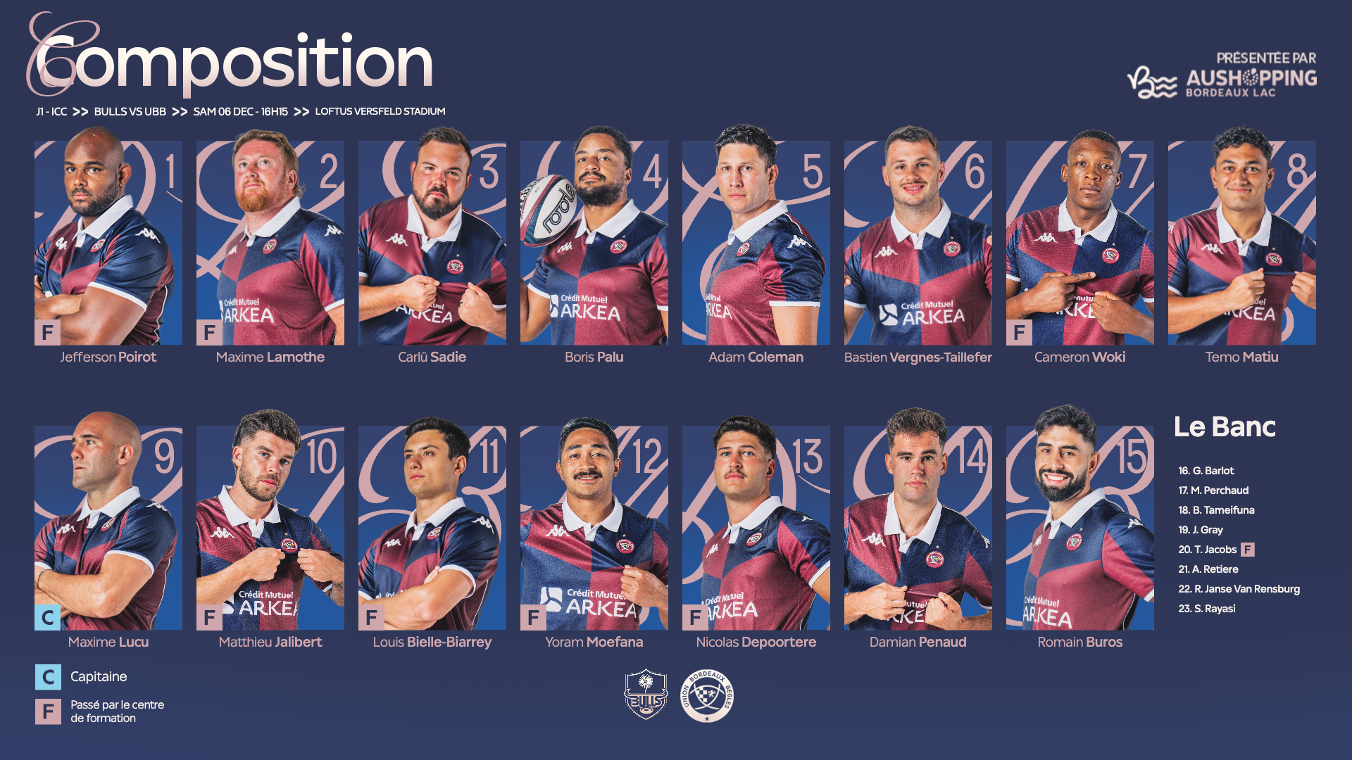 L’UBB aligne un XV très proche de son ossature habituelle : Buros, Penaud, Depoortere et LBB composeront une ligne de trois-quarts ultra-offensive, tandis que Jalibert et Lucu (capitaine) mèneront le jeu. Devant, le staff reconduit le trio Poirot – Lamothe – Sadie, avec un attelage Palu / Coleman en deuxième ligne.