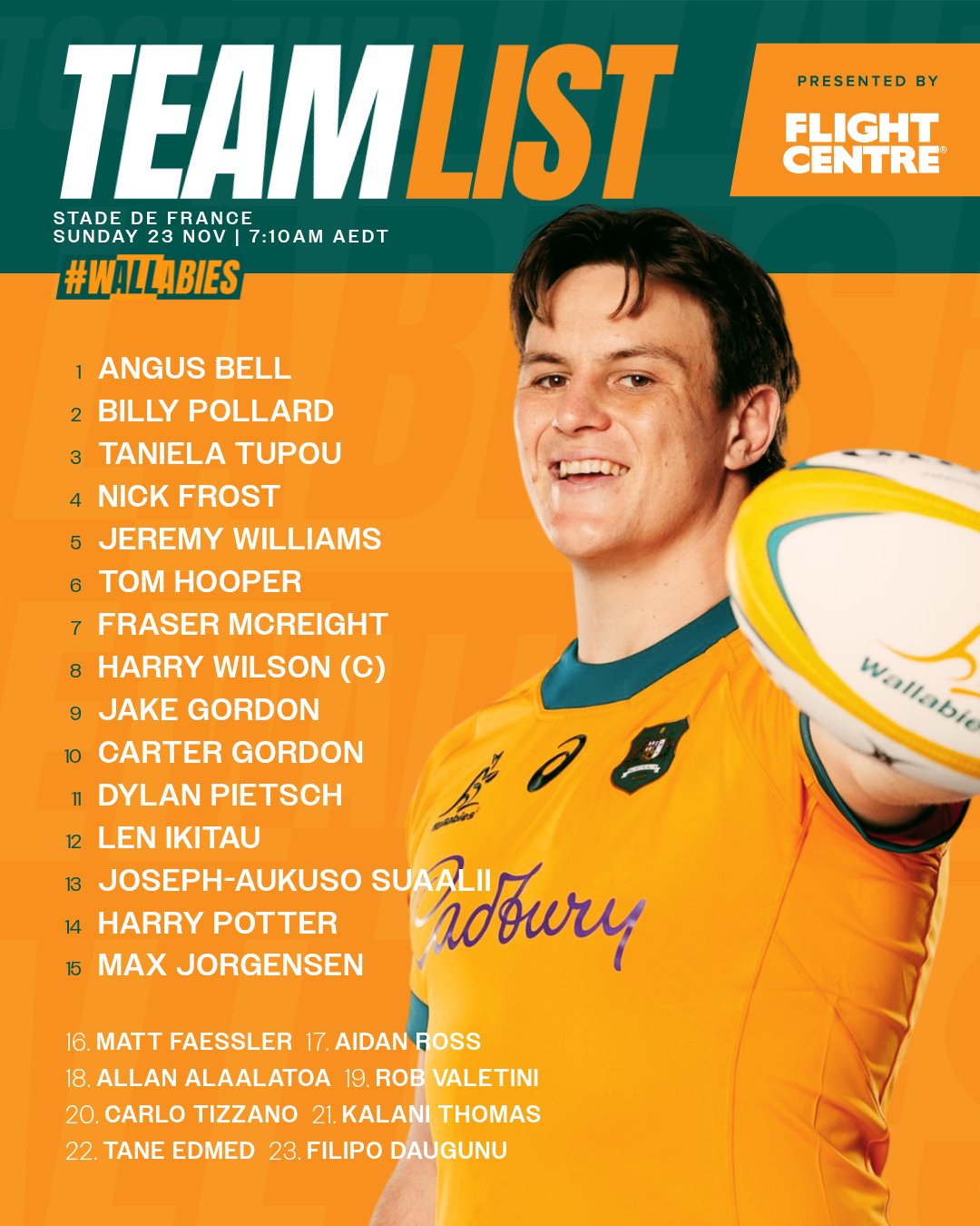 Joe Schmidt a tranché : pour affronter la France, l’Australie titularise Carter Gordon à l'ouverture. Une décision forte pour un joueur qui ne connaîtra là que sa 2e titularisation en 2025, lors du 15e match de l’année des Wallabies. Gordon, 9 sélections, a fait son retour dans le XV australien en octobre, moins de deux heures après l’annonce de son départ de la NRL et des Gold Coast Titans. Il formera la charnière avec Jake Gordon (36 sélections). Une charnière inédite pour un choc attendu dans cette tournée de novembre.