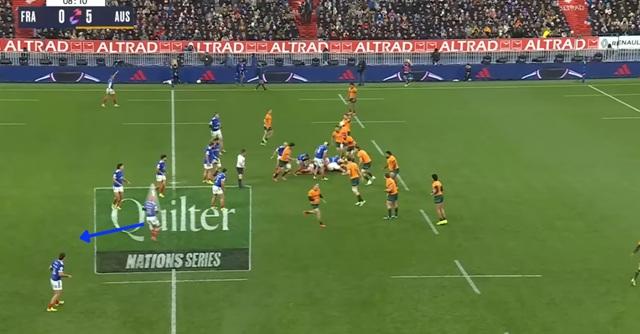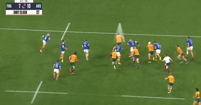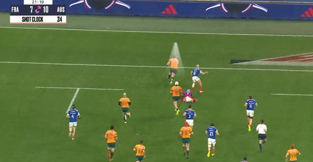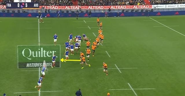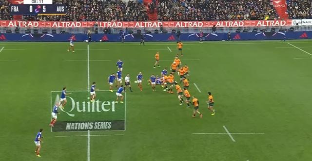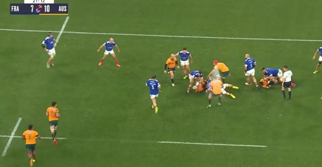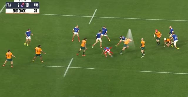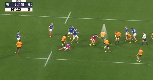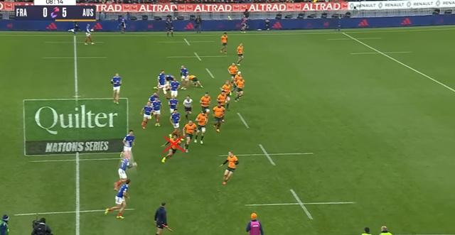 Contrairement à leur habitude, les Bleus n’ont pas toujours réalisé une « rush défense », visant à couper les extérieurs et à monter très rapidement sur le porteur de balle. Cette hésitation au moment de monter plaquer l’adversaire a permis aux Australiens de prendre de la vitesse et de gagner de précieux mètres sur leur collision. Un retard dans les montées défensives qui a entraîné 22 plaquages manqués sur l’ensemble du match (source RugbyPass). Le XV de France a même fini la rencontre avec un pourcentage de réussite aux plaquages inférieur à celui de l’Australie (85 % contre 88 %).