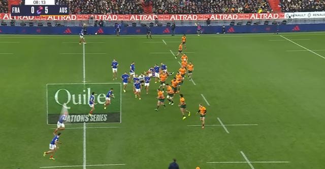 Dès le coup d’envoi, les Bleus se sont fait surprendre par les Wallabies, avec une première percée et une remontée de balle depuis leur propre camp jusqu’à la ligne médiane. S’ensuit une pénalité contre le XV de France, une touche et plusieurs temps de jeu bien animés par le demi de mêlée Jack Gordon. Une action qui entraîne l’essai du talonneur Matt Faessler, après plusieurs plaquages manqués et subis du côté français, notamment sur le centre Len Ikitau.