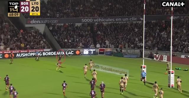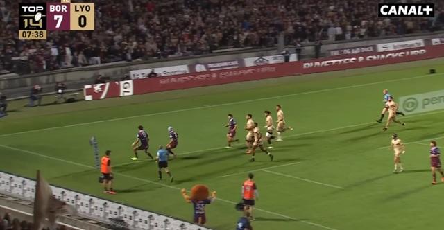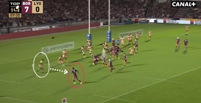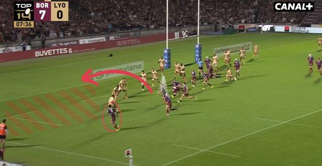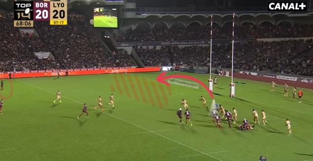 Le demi d’ouverture Matthieu Jalibert est à l’origine de cette action, choisissant d’inverser le sens de jeu en revenant dans le côté fermé. L’international tricolore anticipe parfaitement la montée approximative de Jiuta Wainiqolo sur son aile, pour déposer un jeu au pied dans l’en-but lyonnais pour son premier centre.