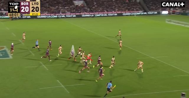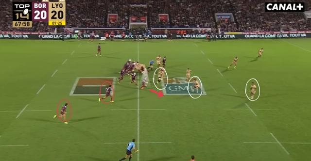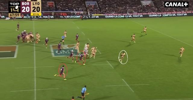 Pendant ce temps, le numéro dix lyonnais Paddy Jackson doit reculer et réaliser une défense en contrôle pour attendre ses partenaires à son l’intérieur. Une attente qui permet à Matthieu Jalibert de fixer au maximum son vis-à-vis pour donner le ballon à Nicolas Depoortère qui se retrouve en situation de deux contre deux avec Damien Penaud et beaucoup d’espaces. Suite à cette avancée, l’ouvreur international va lui-même chercher le ballon dans le ruck pour s’extraire et réaliser une magnifique passe au pied à Salesi Rayasi.