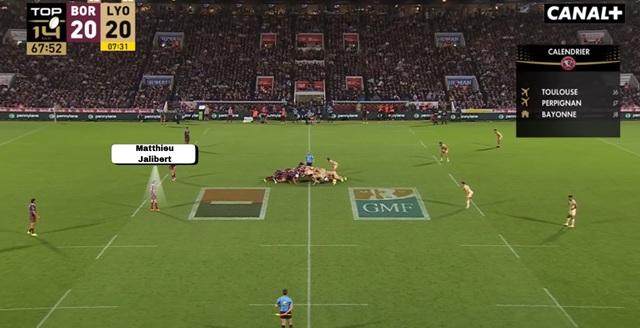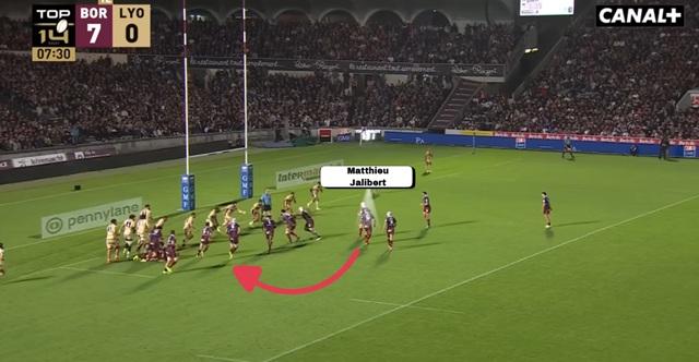 Pour revenir à cet essai, il permet à Bordeaux de reprendre l’avantage alors que le score était encore de 20-20 à un peu plus de dix minutes de la fin de la partie. À l’origine de cette action, c’est Matthieu Jalibert qui crée le décalage dès sa prise de balle. L’ouvreur se positionne très à plat, avec peu de profondeur pour recevoir la passe de Cameron Woki. Sur sa prise de balle et grâce à son accélération, il se décale pour contourner le troisième ligne aile adverse, ce qui oblige Esteban Gonzalez à rentrer dans le premier rideau défensif.