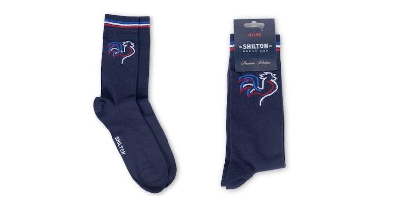 On commence par le bas, avec les chaussettes France Navy. Assorties au reste de la tenue, elles vous permettront de vous sentir confortable pendant la rencontre. Ces dernières vous donneront peut-être même envie d'imiter les Bleus, et de claquer un drop en plein milieu du salon, avec le ballon que Shilton vous aura offert pour tout achat de tee-shirt (petit modèle) ou d'un maillot (ballon grand modèle). Vous retrouverez ce modèle à 7,50€ sur la boutique Shilton.