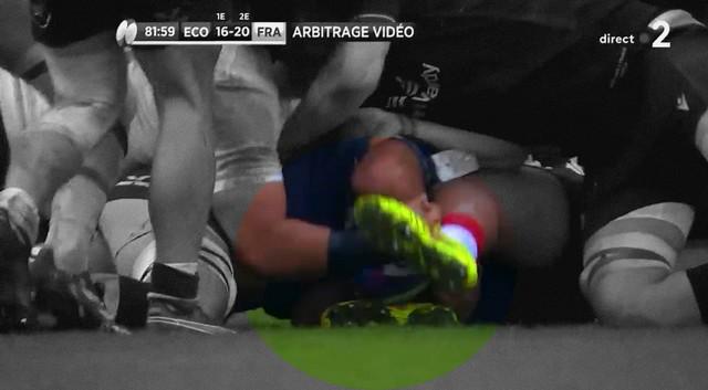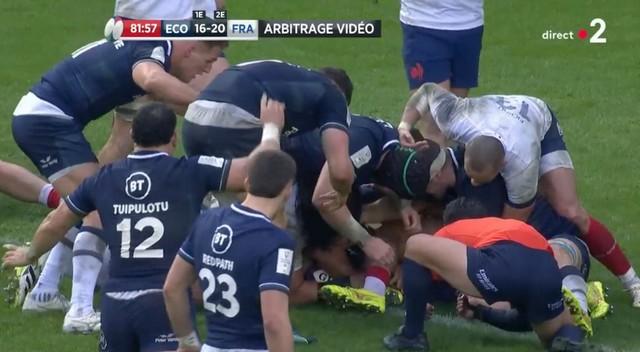 Tout se joue en quelques secondes. L’Écosse pilonne la ligne française, Skinner est au cœur du combat et semble parvenir à franchir la ligne de but. Berry estime avoir vu le ballon au-dessus de la ligne mais empêché d’être aplati, possiblement bloqué par le pied de Yoram Moefana. Il annonce donc un appel terrain “No try / held up”.