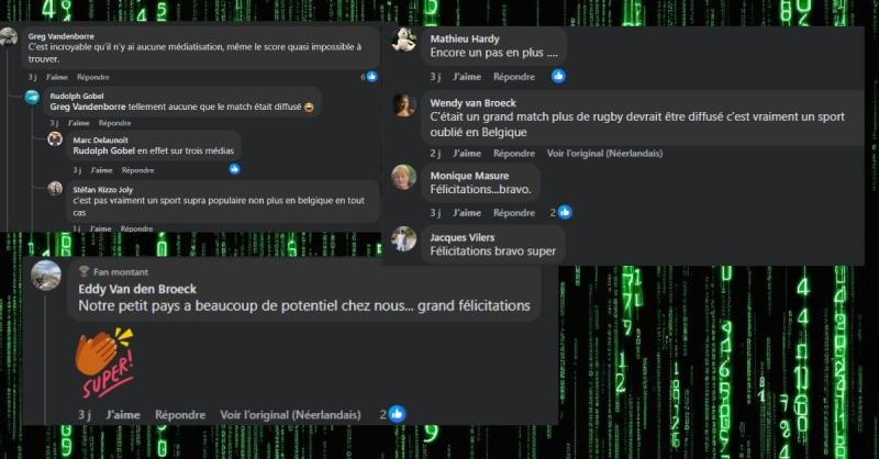 Enfin, la RTBF rappelle que « malgré un classement supérieur (22e mondial), battre la Namibie reste un exploit majeur pour notre sélection. Les Welwitschias ont en effet participé à chacune des sept dernières Coupes du monde de rugby. Cette victoire va donc donner un incroyable boost de confiance à la Belgique ».