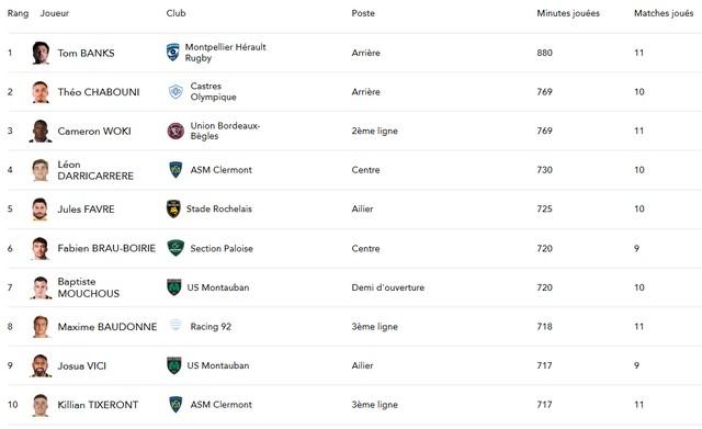 Chez les demis d’ouverture, Joris Segonds (713 à Bayonne) et Louis Carbonel (712 au Stade Français) sont très sollicités, mais sans écraser le classement. Les arrières comme Banks, Léo Barré (680) ou Baptiste Mouchous (720 minutes à Montauban) confirment que le poste reste l’un des plus exposés physiquement.