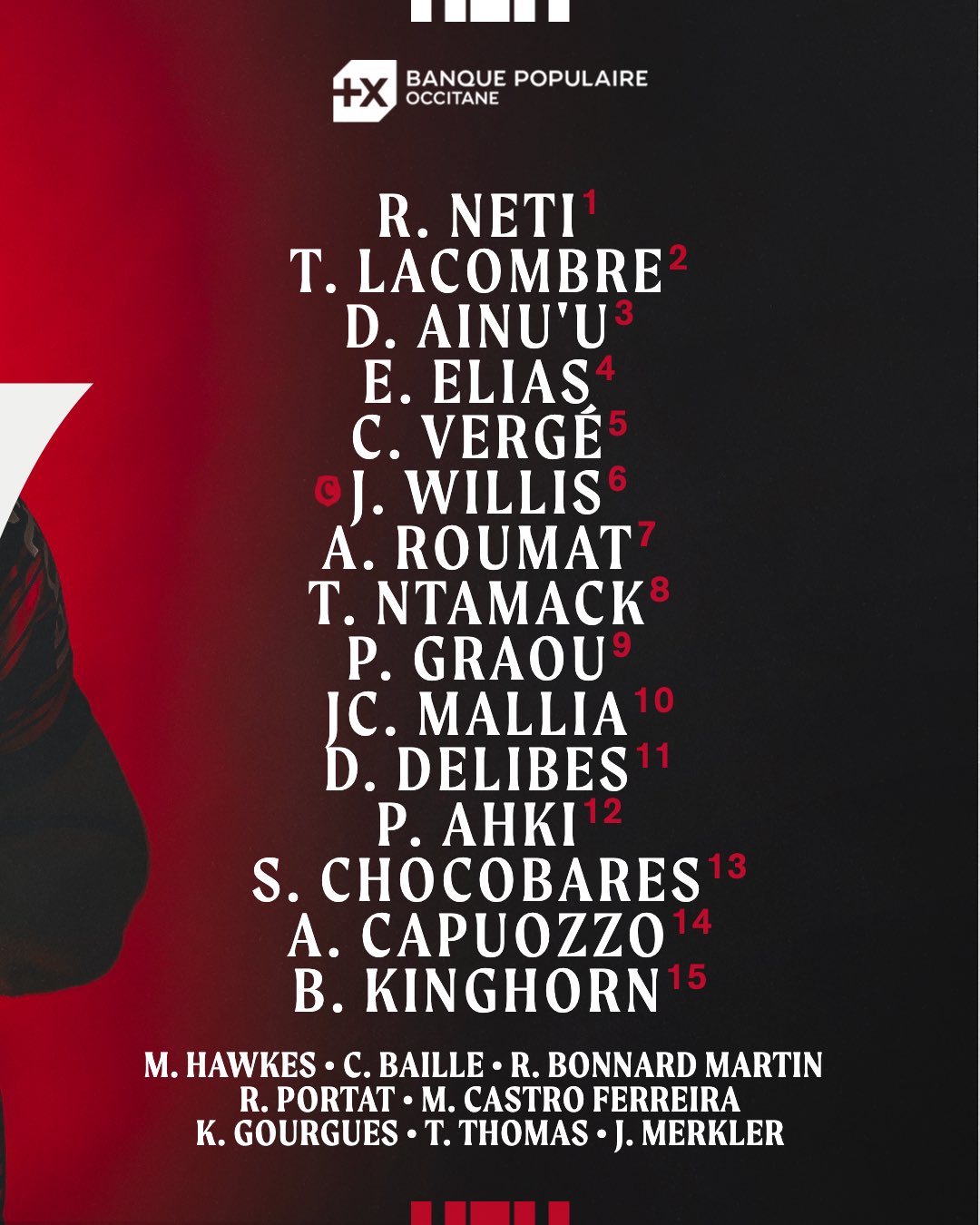 Privé de ses internationaux, Toulouse fait confiance à ses jeunes pousses. Mallia glisse à l’ouverture, épaulé par Graou à la mêlée, tandis que Kinghorn, Capuozzo, Chocobares et Ahki composent une ligne de trois-quarts plus internationale que jamais. Lebel n'est pas sur la feuille et c'est Delibes qui assurera à l'aile.