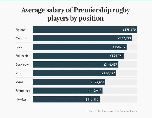 C'est en tout cas ce qu'il ressort du rapport de la Premiership sur le salary cap. Outre-Manche, le salaire annuel moyen pour un numéro 10 est d'un peu plus de 200 000 euros alors qu'un talon devra se "contenter" de 130 000 euros en moyenne. Le Times rapport que le revenu moyen d'un demi d'ouverture était de 204 406 euros, mais 13% de tous les numéros 10 de la ligue sont payés plus de 465 000 euros, de loin les salaires les plus élevés de tous les postes. On trouve ensuite les centres (195214 euros) puis les 2es lignes avec un salaire moyen de 184 554 euros. Cependant, un quart de tous les deuxièmes sont payées plus de 200 000 livres et six pour cent touchant plus de 400 000 livres.