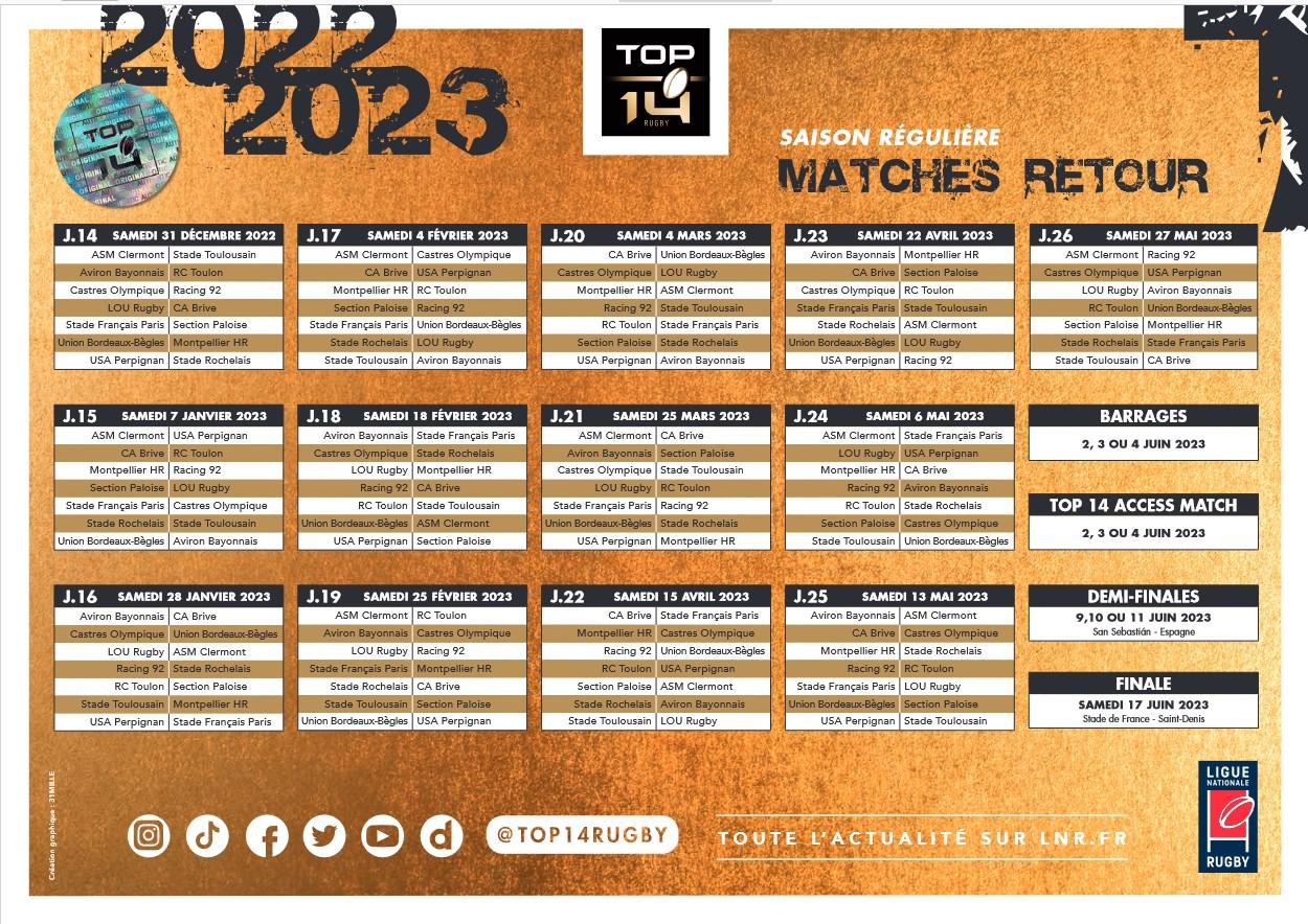 La phase retour commencera non pas en 2023 mais le 31 décembre lors de la 14e journée. En cette année de Coupe du monde, la finale aura lieu une semaine plus tôt que cette année, le 17 juin en l'occurrence. Pour rappel, les demies se dérouleront en Espagne. La LNR précise qu'il y aura 6 matchs le samedi et une rencontre le dimanche. Pour l'heure, toutes les rencontres ont été positionnées le samedi.