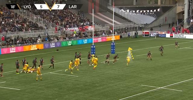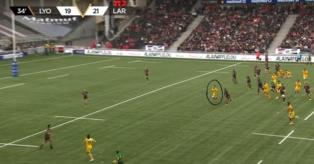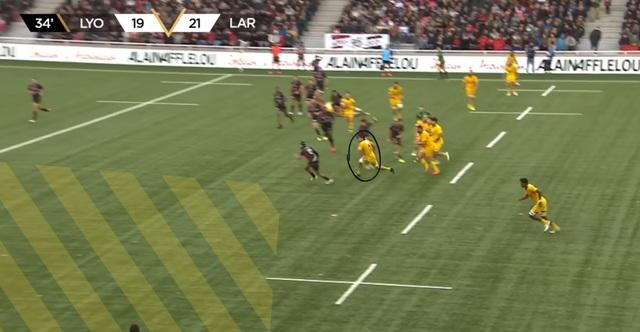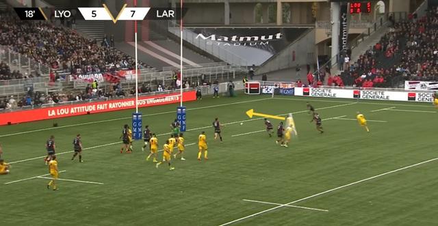 Cette anticipation du numéro dix rochelais s’est fait ressentir à travers deux jeux au pied parfaitement réalisés. La passe au pied pour son centre Jules Favre qui entraîne l’essai de Paul Boudehent (vu précédemment), mais aussi le rasant pour Davit Niniashvili. L’ancien joueur du LOU marque donc face à son ancienne équipe, après un coup de pied dans le dos de deux centres lyonnais de son demi d’ouverture.