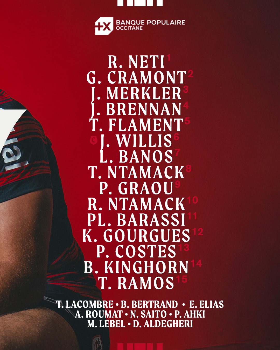 Blair Kinghorn est à l’aile, associé à Ramos à l'arrière et Barassi de l'autre côté. Les supporters souffleront aussi en voyant le nom de Théo Ntamack sur la feuille. Le troisième ligne, touché à la tête à Clermont, a passé tous les protocoles et formera une solide paire avec Jack Willis, capitaine du soir.