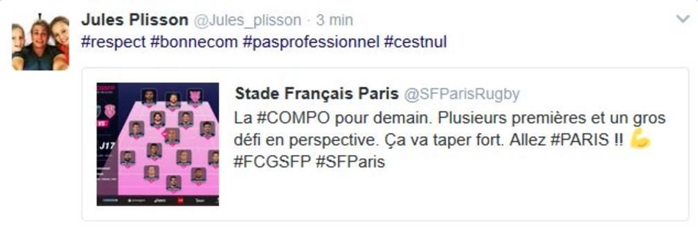 Une manière de mettre en avant le léopard rose, particulièrement présent sur les réseaux sociaux depuis quelques semaines, et qu'on peut également rencontrer au stade Jean-Bouin. Seulement, ce tweet a passablement énervé Jules Plisson et Hugo Bonneval. Si les deux joueurs ont depuis supprimé leurs gazouillis, ils n'ont pas été tendres avec leur club, l'arrière lâchant notamment un #guignol.