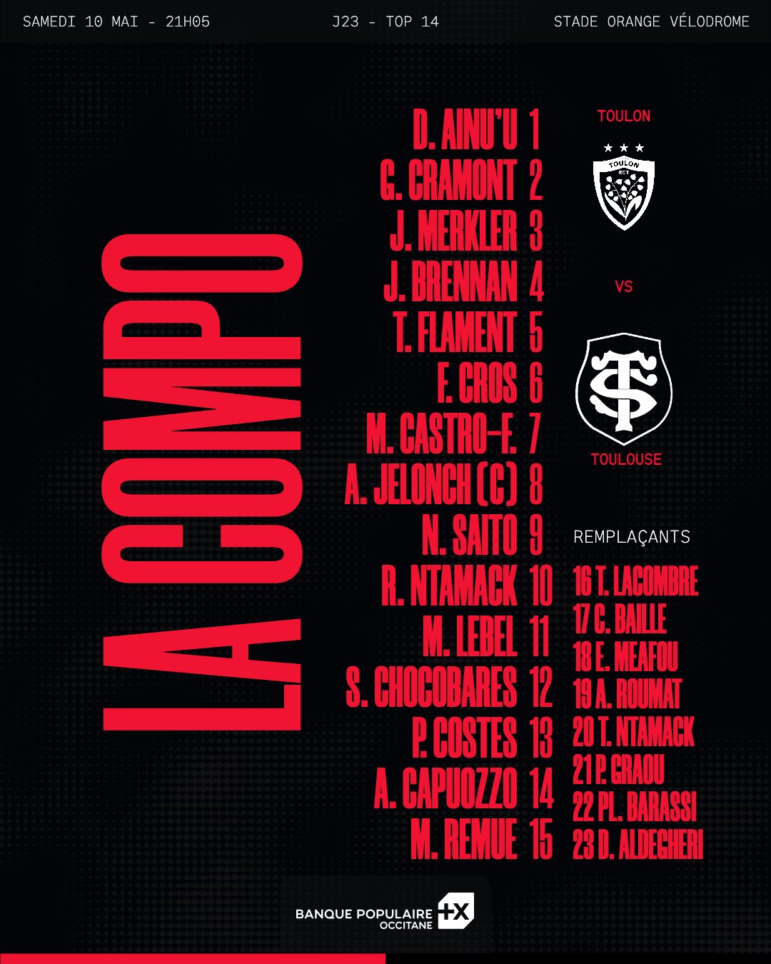 Sur le banc, plusieurs jeunes comme T. Ntamack et Lacombre pourraient avoir leur mot à dire. À noter les absences confirmées de plusieurs cadres majeurs : Ramos (mollet), Kinghorn (genou), Arnold sans oublier Mauvaka, Dupont et Laulala, forfaits pour la fin de saison.