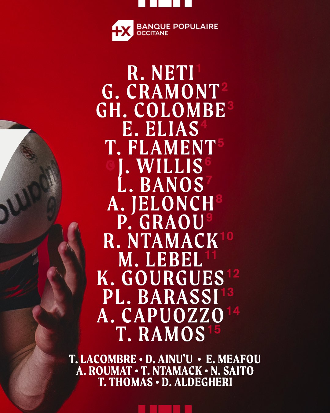 Au centre, on retrouve la paire Gourgues-Barassi, pendant que Capuozzo fera ses débuts sur l’aile. Dupont poursuit sa reprise en douceur, tandis que Mauvaka, Cros, Épée ou encore Chocobares sont absents. Le banc toulousain, avec Lacombre, Saito, Thomas ou encore Aldegheri, a fière allure.