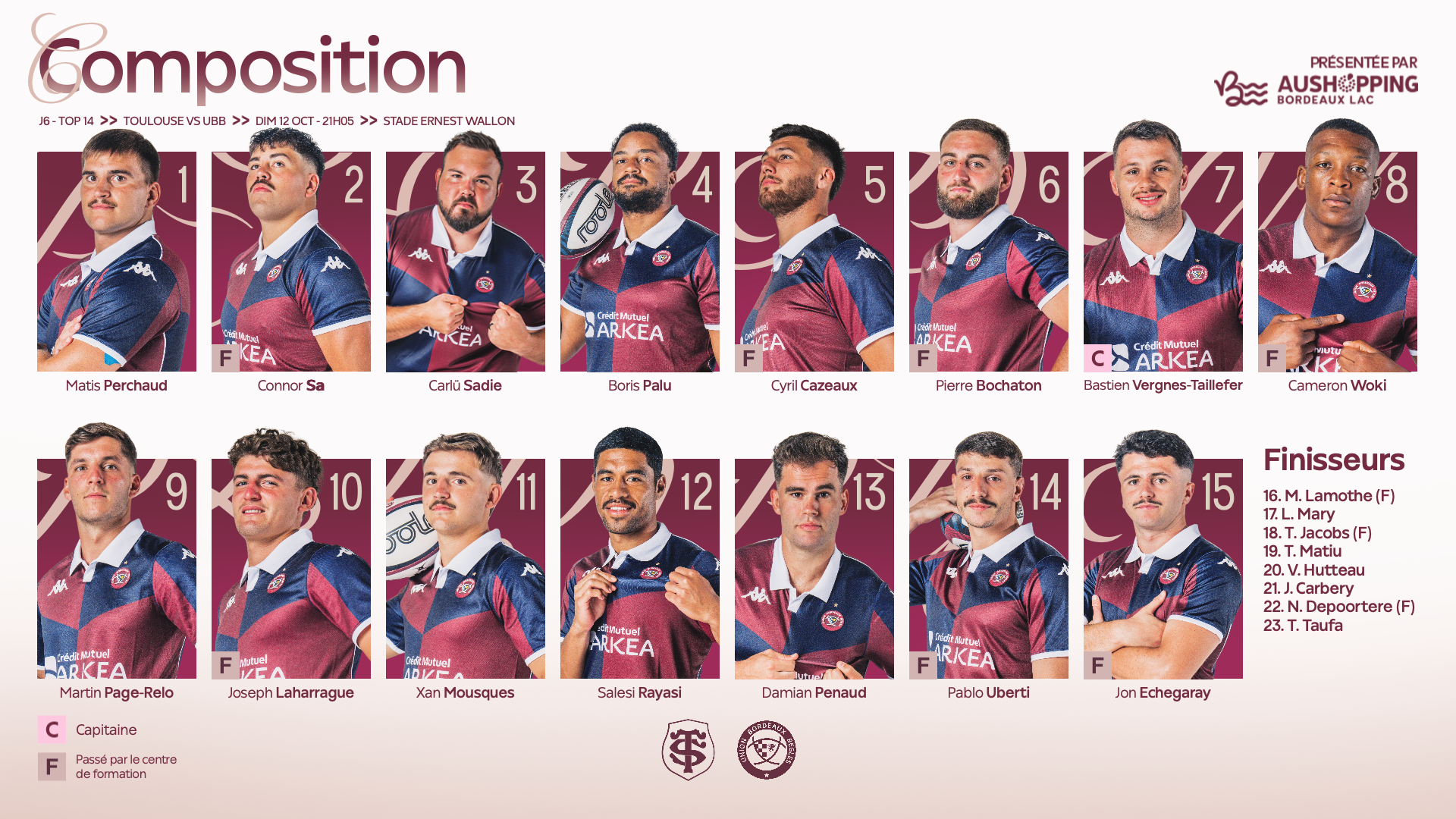 Le Stade Toulousain et l’Union Bordeaux-Bègles ont dévoilé leurs compositions pour le choc de ce dimanche 12 octobre à Ernest-Wallon (21h05), en clôture de la 6e journée de Top 14. Une affiche entre deux prétendants au haut de tableau, dans un début de saison marqué par les absences mais aussi par des jeunes qui pointent le bout de leur nez.