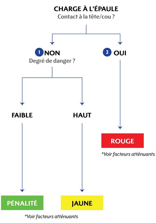 Tout d'abord, l'homme au sifflet doit déterminer s'il s'agit d'un plaquage haut ou bien d'une charge à l'épaule. Pour cela, il doit observer la position du bras du plaqueur au moment du contact avec le porteur de balle. Selon le cas, l'arbitre se pose ensuite plusieurs questions comme l'explique le site de World Rugby :