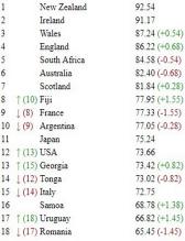 Elle est coincée dans une zone intermédiaire, loin derrière les huit meilleurs, nettement au-dessus des équipes que tu cites, et en compagnie des Argentins et Fidjiens, les Japonais pas si loin.
